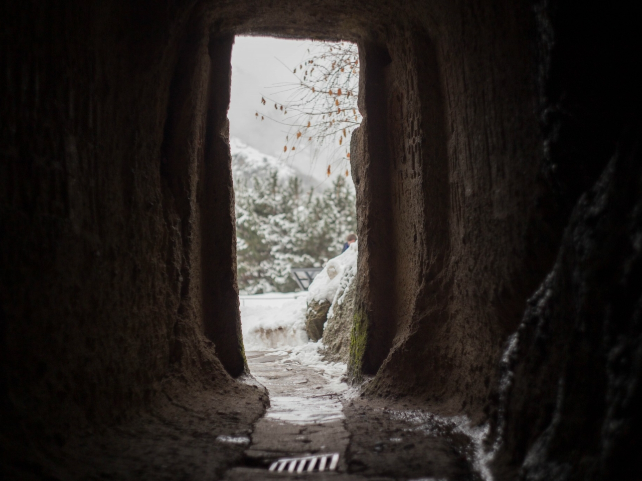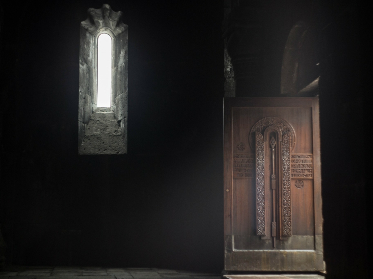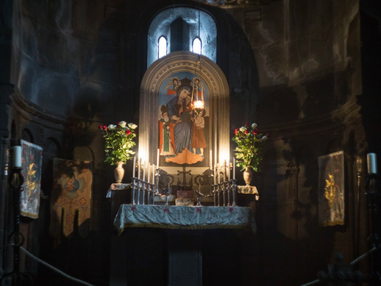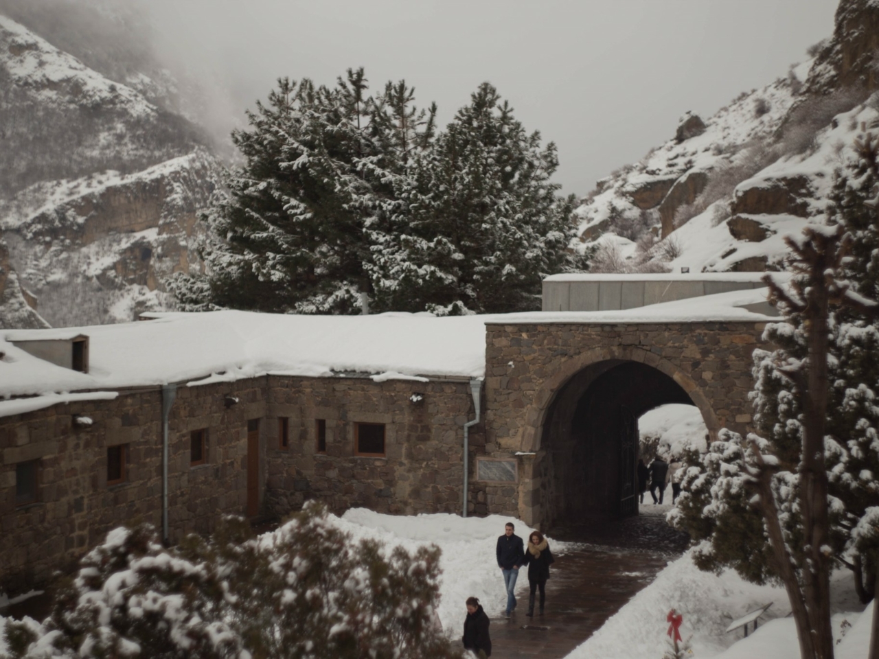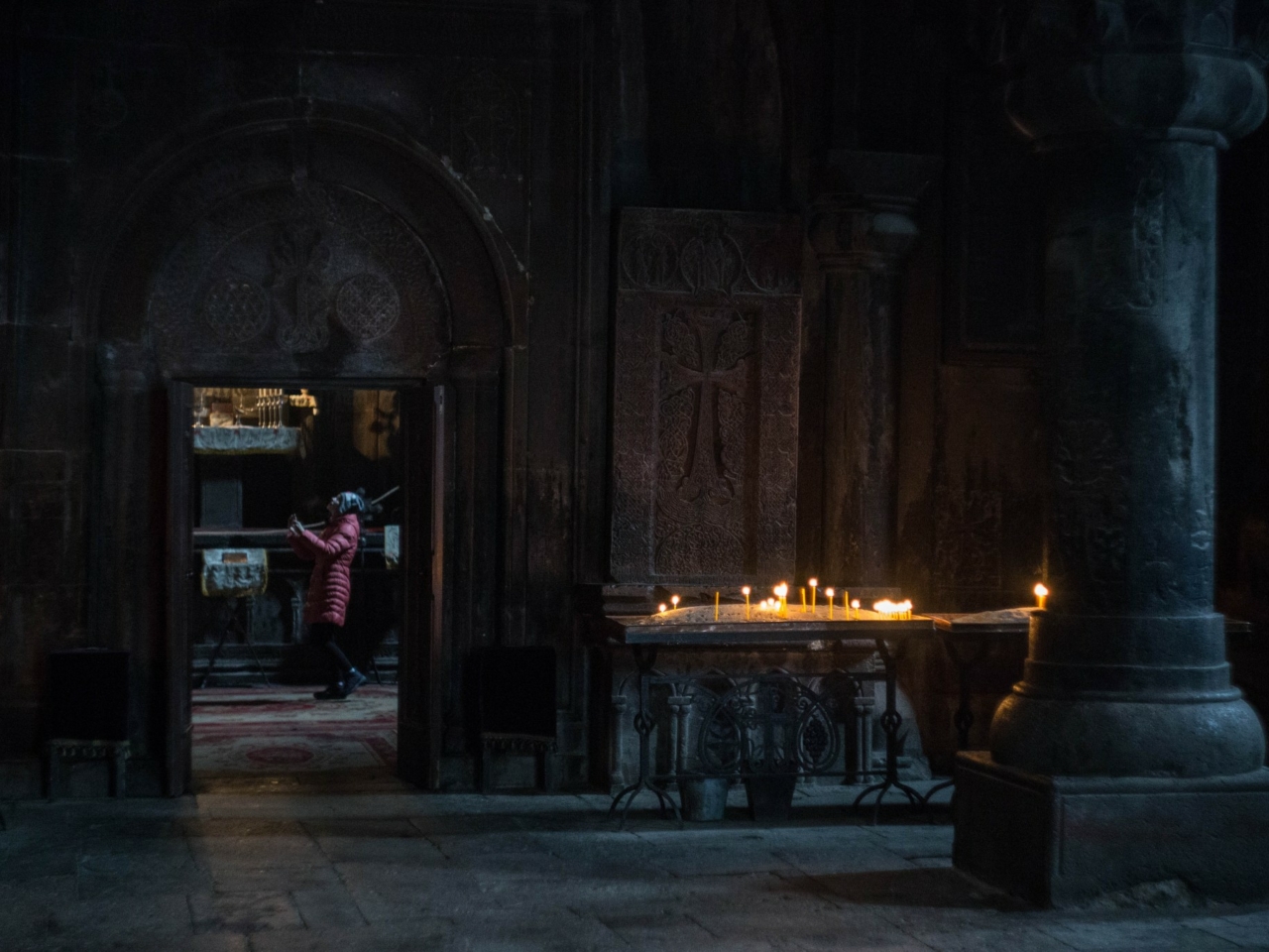 Среди таких-то пейзажей и пролегал путь в Гегард – древний горный монастырь в сорока километрах к юго-востоку от столицы. Здесь Армения, наконец, вставила по-настоящему – это тебе не Ереван с бесконечными клубами слот-машин и хаотичной рекламой. Рискую свалиться в банальщину, но все же: в ущелье, среди суровых скал, за каменной стеной стояла большая церковь за прямоугольником высокой стены. Она прилепилась боком прямо к крутому горному склону и как бы вырастала из него, глядя в зимнее небо конусовидной верхушкой башни с крестом. Гегард знаменит тем, что значительная часть монастыря выдолблена непосредственно в скалах – тут есть и скальные кельи, и даже скальные церкви. Вообще армянская церковная архитектура впечатлила сильно. С одной стороны – мощно, каменно, тяжеловесно, без излишеств. По-средневековому. С другой стороны, этот древний камень повсюду украшен поразительно искусной резьбой – орнаменты, львы и орлы, надписи на старинных языках. Изнутри церковь выглядела не менее сурово, чем снаружи. Свет поступал лишь через узкие окошки-бойницы – да горели свечи. В своды потолка упирались толстенные колонны. Строгую монохромную гамму разбавлял только алтарь – свечи, очень скромный иконостас и цветы в вазах.