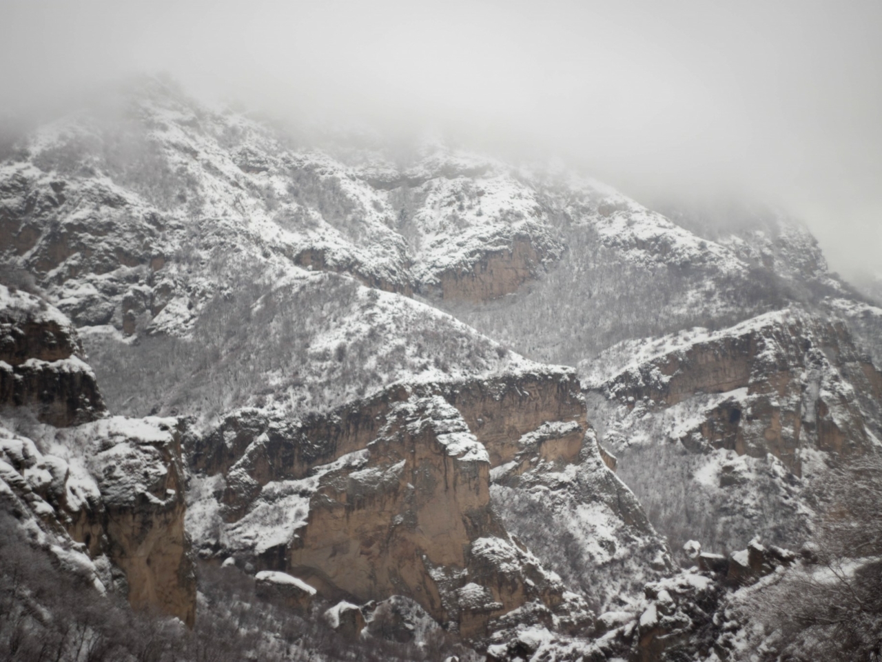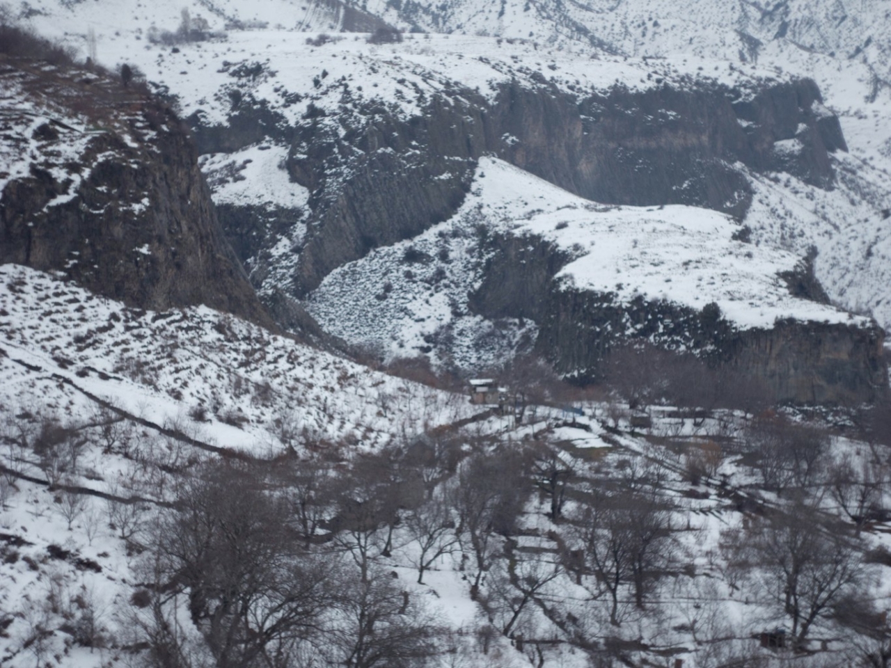 Окраины армянской столицы – панельные спальные районы – неухожены, невыразительны и серы (в тот серый снежно-мокрый день – особенно). В целом напоминают российские. Но окраины быстро кончаются, и за пределами относительно плоского города начинаются горы. Сначала местность холмится. Волны бугров все круче и шире – и вдруг дорога выруливает на серпантин, в мир островерхих скалистых гор с заснеженными вершинами, в мир ущелий и бескрайних белых долин.