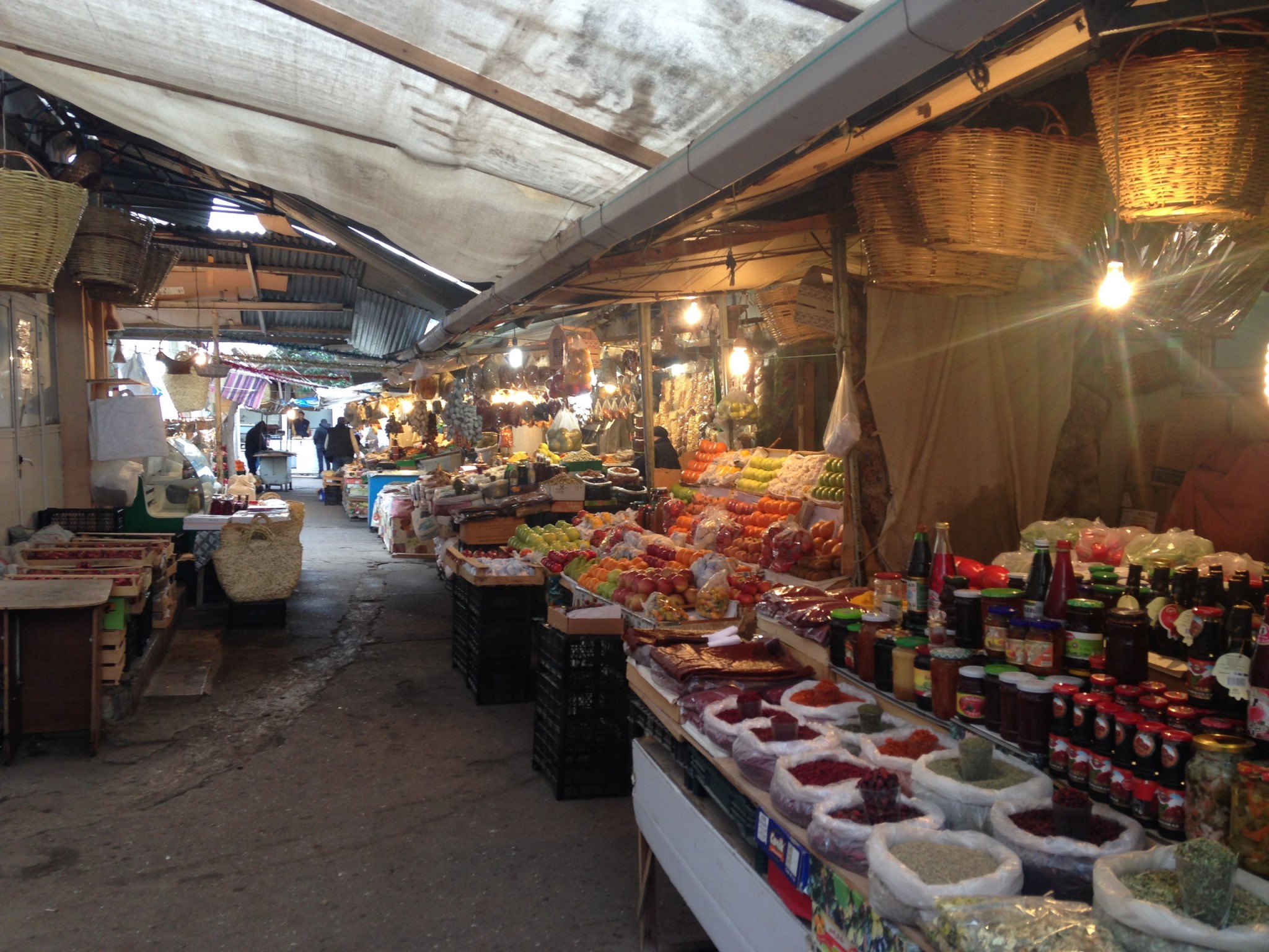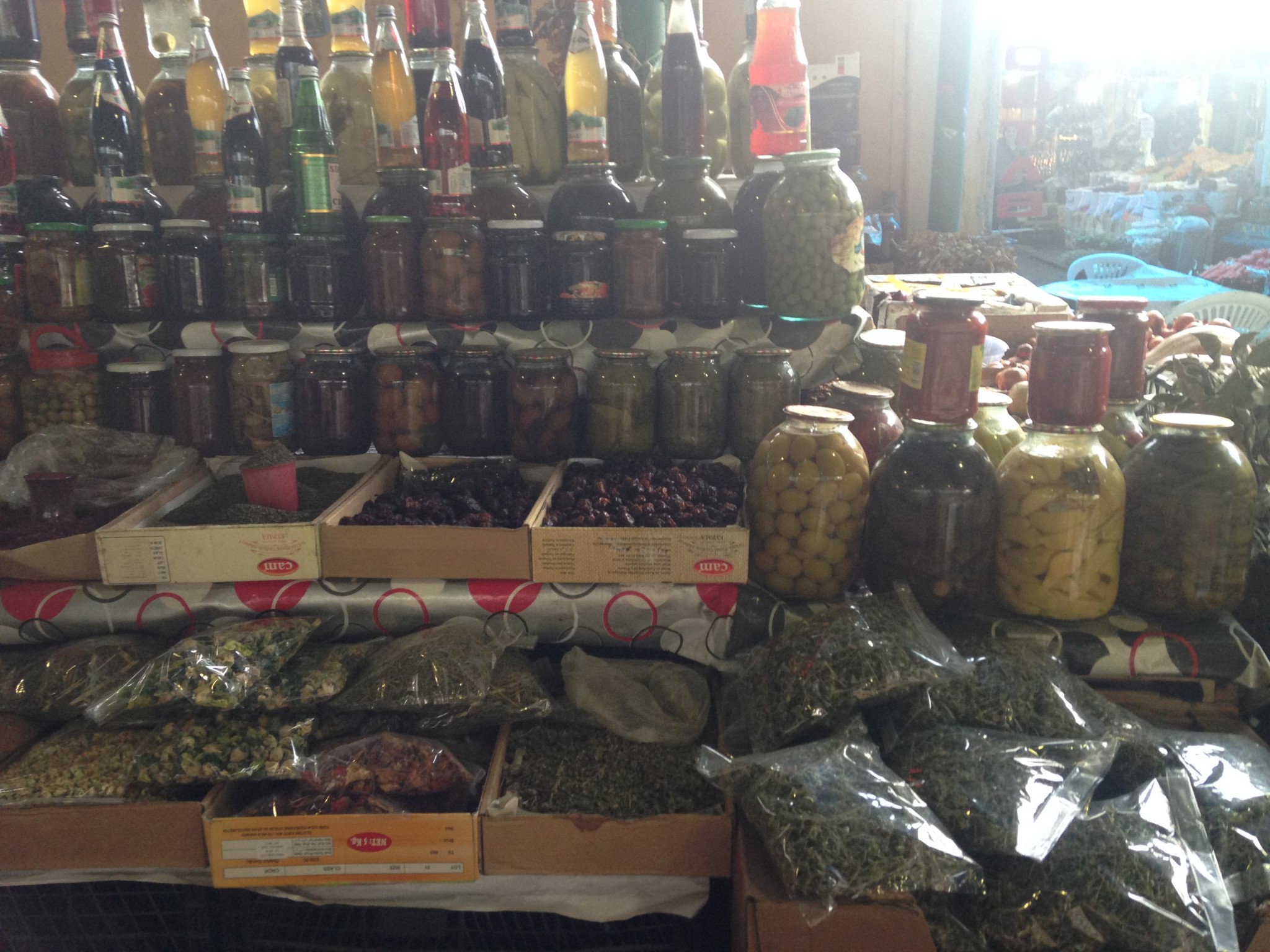 Стоит ли говорить, что обилие разных трав, пряностей, специй, фруктов (в том числе дешевых местных гранатов) поражает воображение? Десятки вариаций свежих сыров выглядывают из марлей и рассолов. Еще здесь выражен своеобразный культ компотов и солений – везде сплошь закатанные банки. Литр свежего гранатового сока обходится в 150 рублей, а чай стоит какие-то копейки.