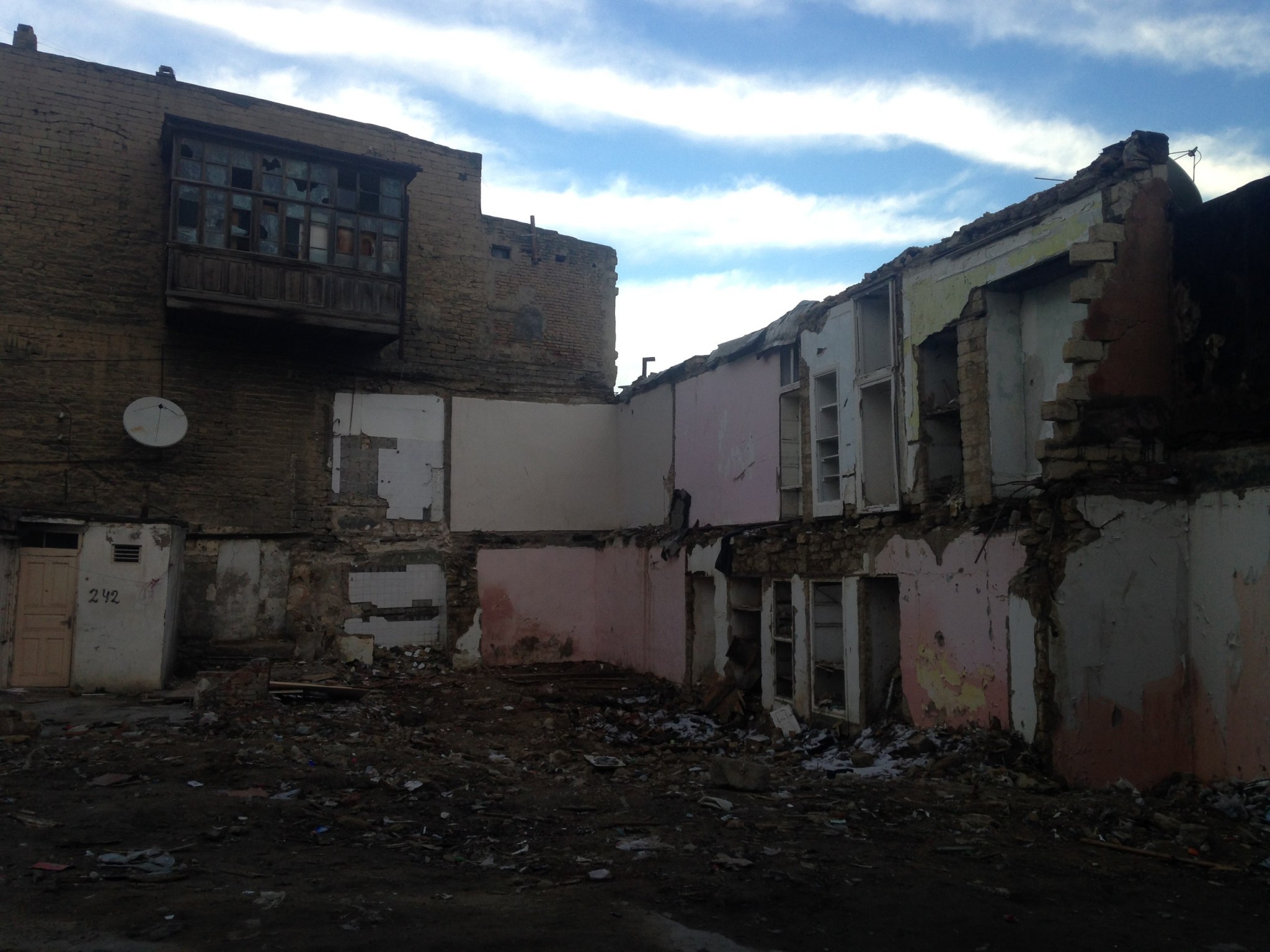 К большому сожалению, сейчас эти кварталы начали сносить, поэтому в этой части города тут и там возникают пустыри, руины, бесконечные срезы фундаментов и личных вещей. Что-то сжигают прямо на месте. Здесь возникает странное ощущение, будто только что прошла война.