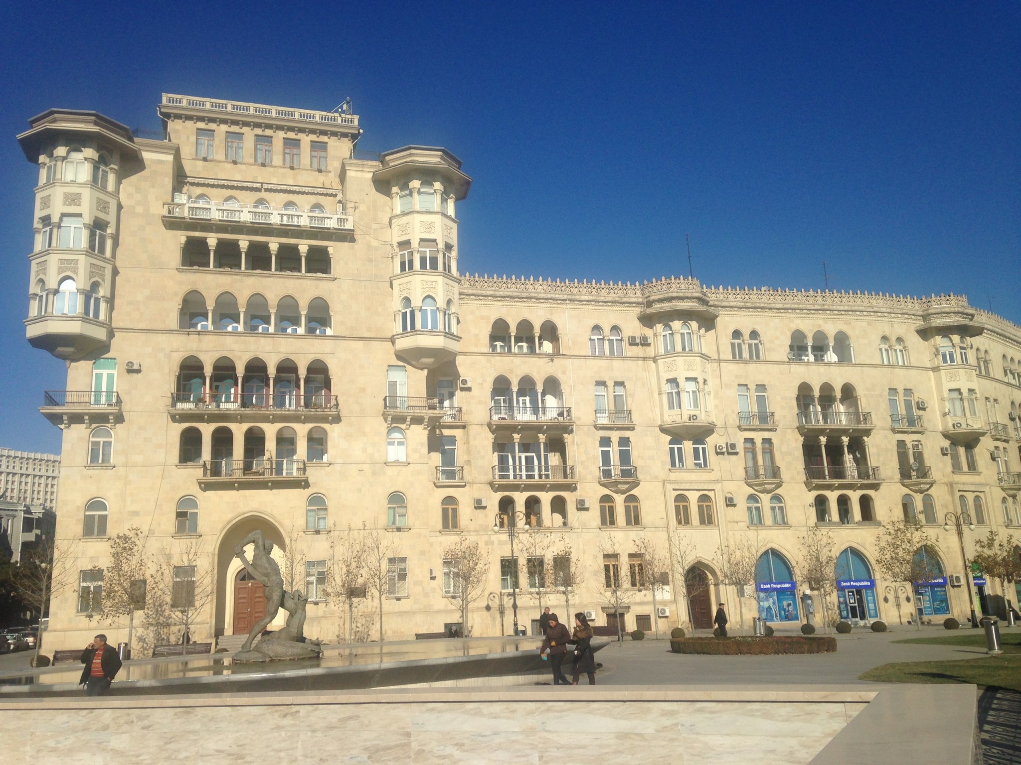 Все здания в центре Баку облицованы песчано-желтоватым камнем. Ухоженные исторические постройки буквально сверкают, а многие советские здания так обшили новыми фасадами, что не верится, что раньше это были типовые хрущевки.