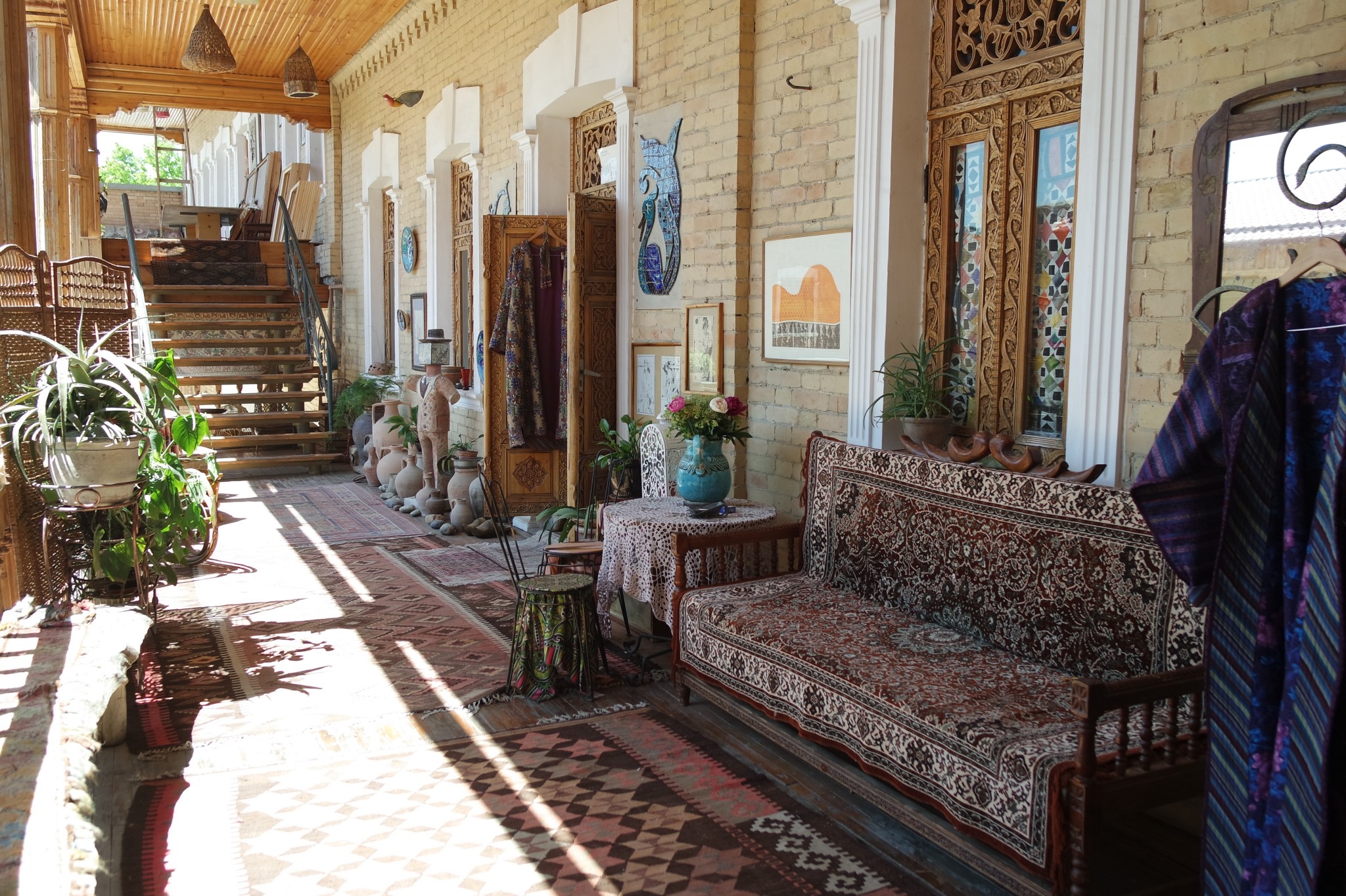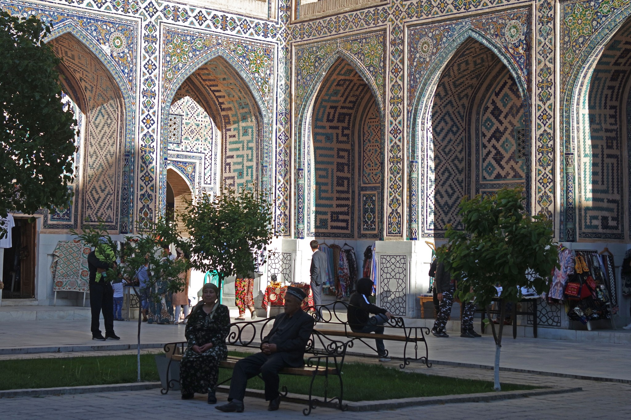Внутри медресе, которые когда-то выполняли функцию мусульманских школ, – уютные дворики, торговые лавки и выставочные залы. В это время здесь не так много туристов, и можно найти свой уголок спокойствия. Вот и местные отдыхают на скамейках и топчанах.