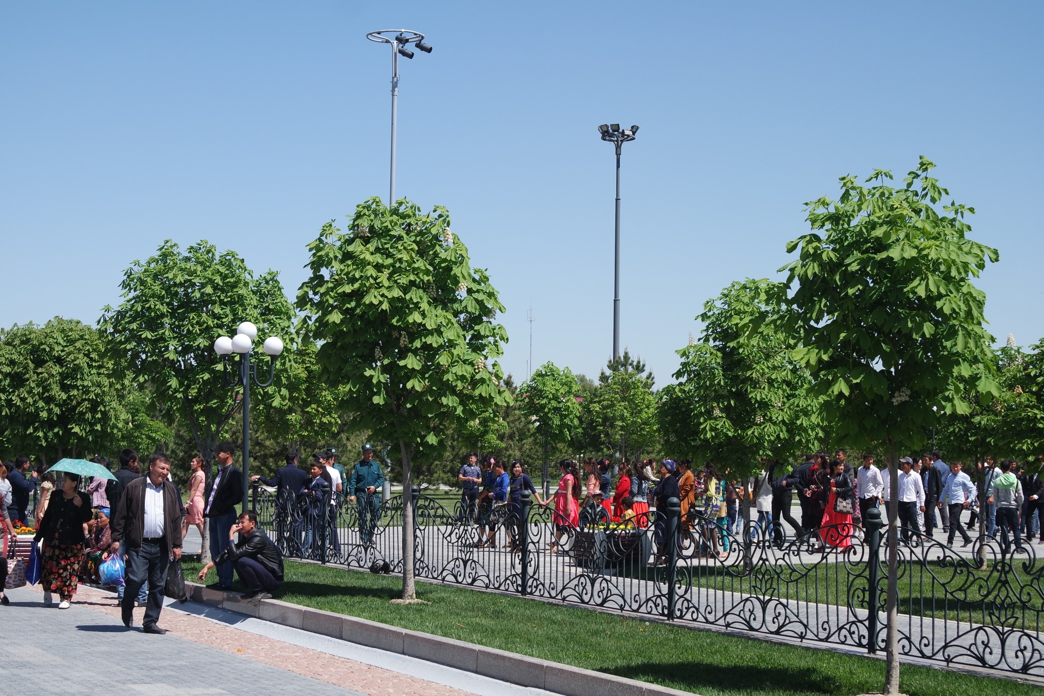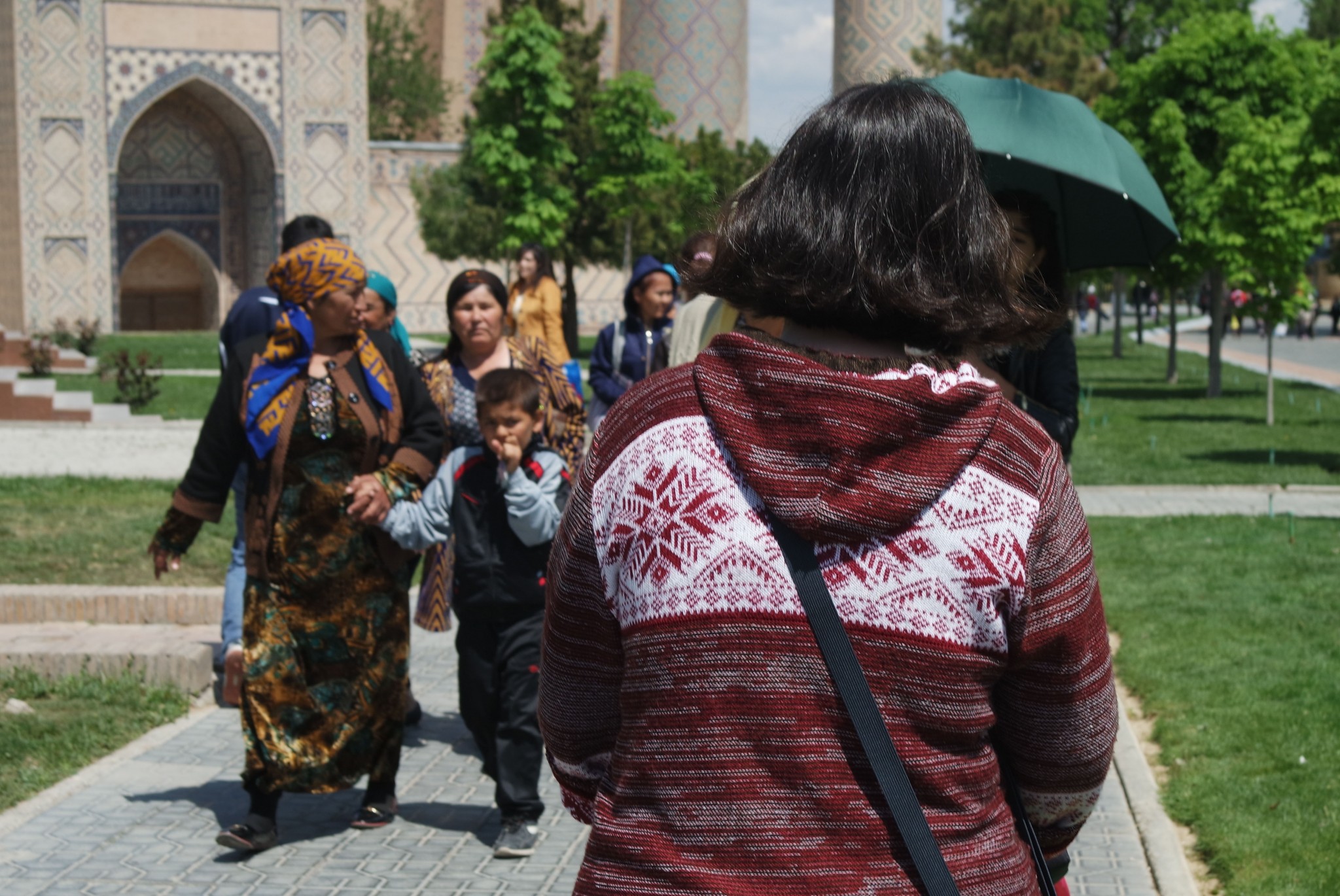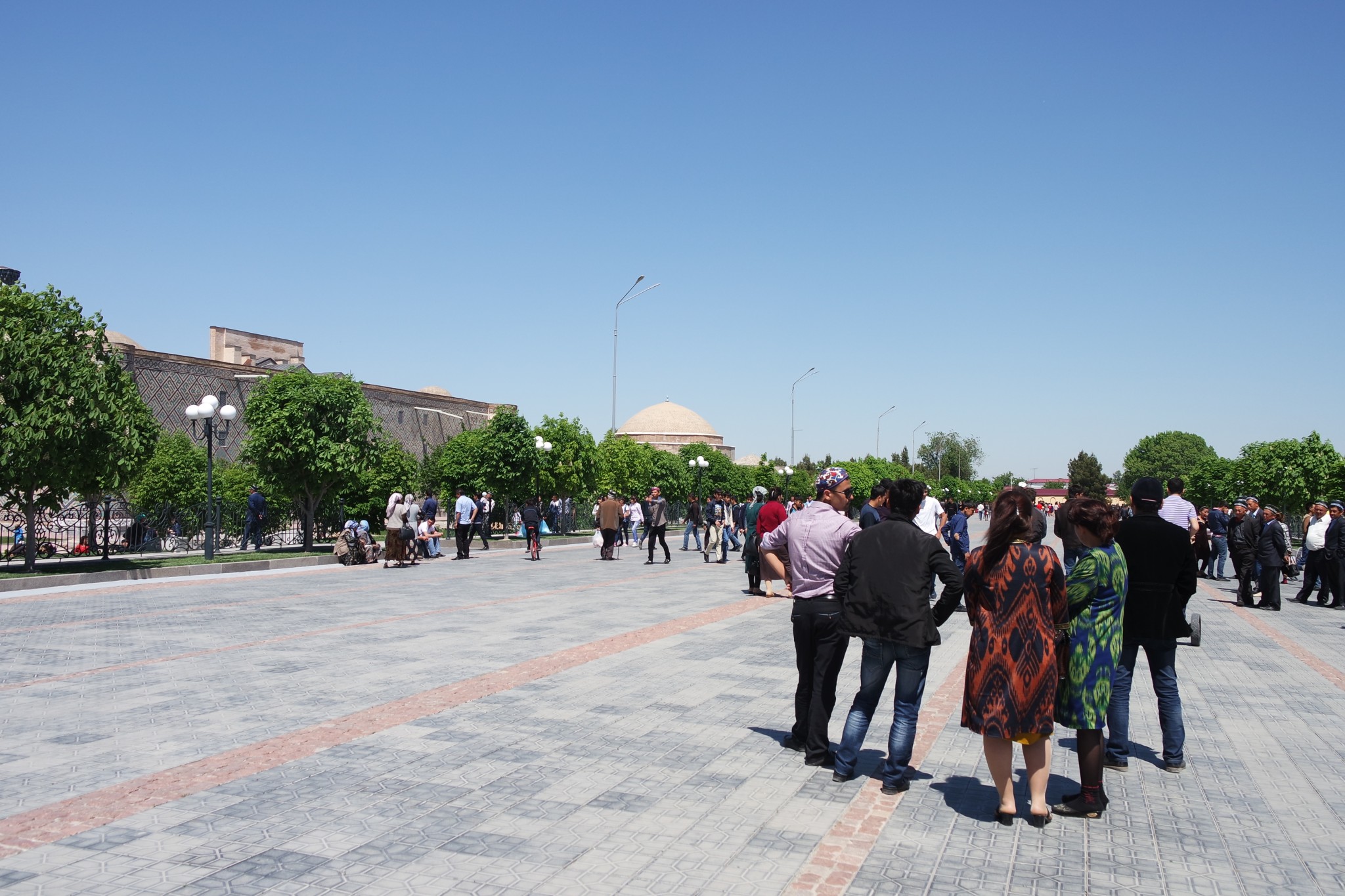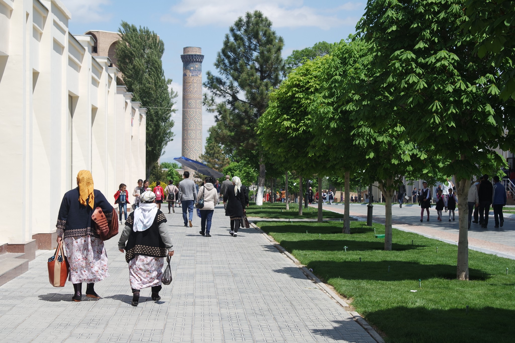 После нескольких дождливых дней среднеазиатское солнце разворачивается по полной и отражается бликами на голубых куполах медресе. Женщины в ярких нарядах куда-то спешат, бабульки, распихивая друг друга, пытаются влезть в электромобиль, который явно не рассчитан на такой ажиотаж, статные мужчины в костюмах и тюбитейках общаются в сторонке от суеты, под ногами носятся друг за другом детишки, шумная молодежь кучкуется на ступеньках обзорной площадки и делает бесконечные селфи на фоне Регистана. Так выглядит воскресный день в центре Самарканда. Делимся с читателями кадрами фото-прогулки по городу.
