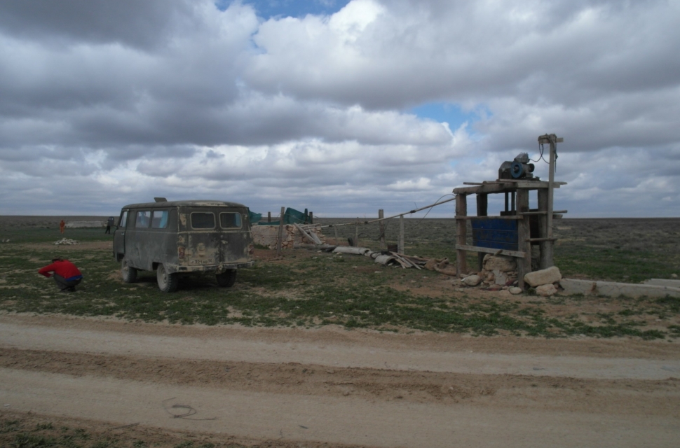 Порой тонкие полоски дорог на спутниковых снимках вдруг пересекаются в одной точке. Это значит, что там находится колодец. Колодцы все старые, сделаны кочевниками. Те обычно кочуют где-то неподалеку. Колодцы представляют собой шахты глубиной по 30-50 м, стены обложены камнями. Иногда механизм оборудован бензиновым мотором. Действует колодец так: длинная закольцованная брезентовая лента из брезента поднимает на себе влагу, влага счищается щеткой в желобок. Вода солоноватая – она там не результат дождей, а что-то типа полезного ископаемого.