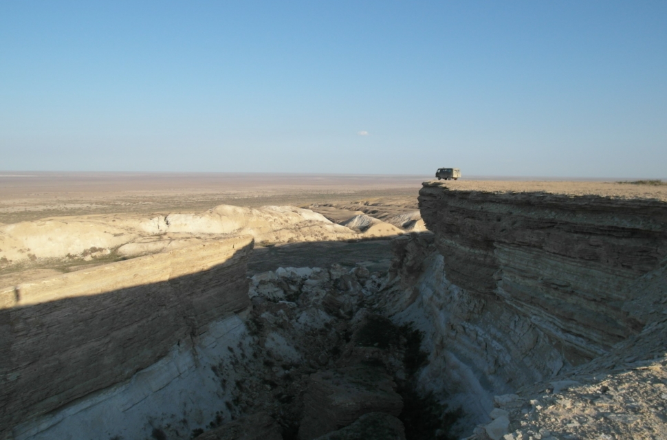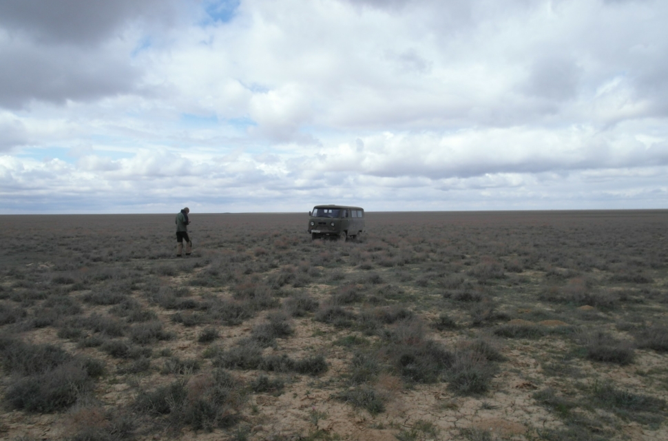 Первой целью был полуостров Мангышлак в Каспийском море, там одна из самых засушливых пустынь в мире (засушливость оценивают по количеству испаряемой воды и объему осадков). Это самый запад Казахстана. Наш путь пролегал через степи – они начались еще в окрестностях Астрахани. Дорог в казахстанских степях, постепенно переходящих в пустыню, практически нет, а есть направления. Это наглядно видно на снимках из космоса – по бежевой земле целой паутиной тонких ниточек бегут эти направления, то сходясь друг с другом, то расходясь.
