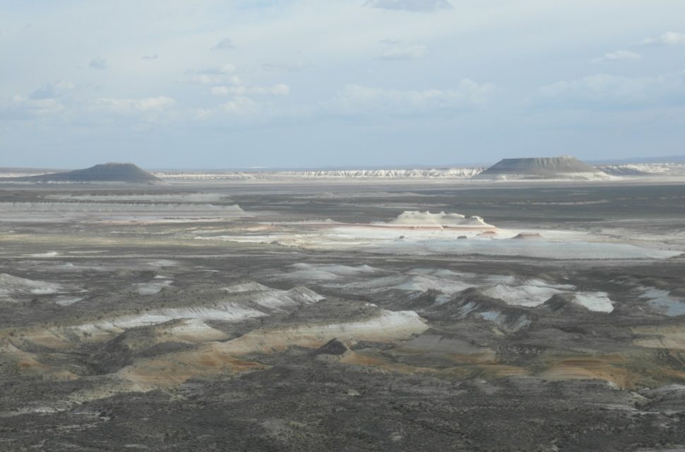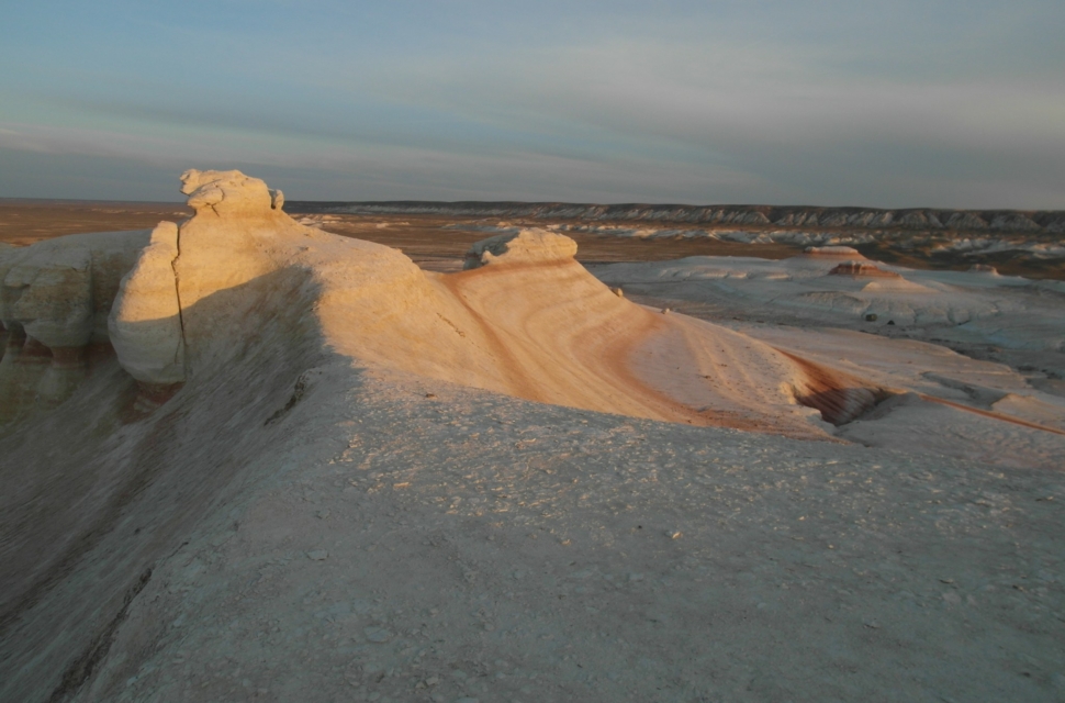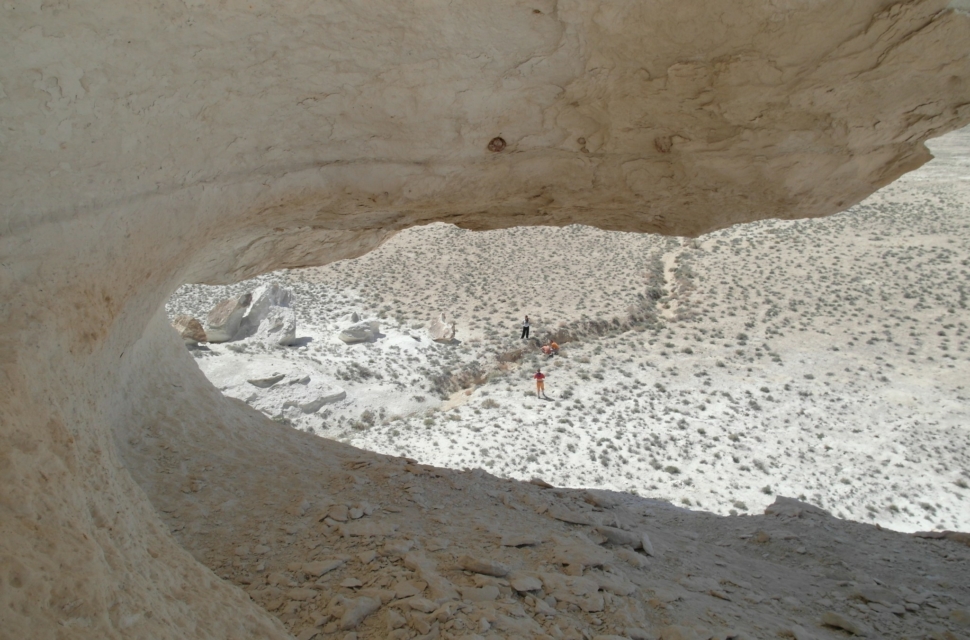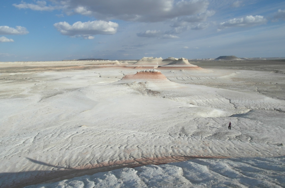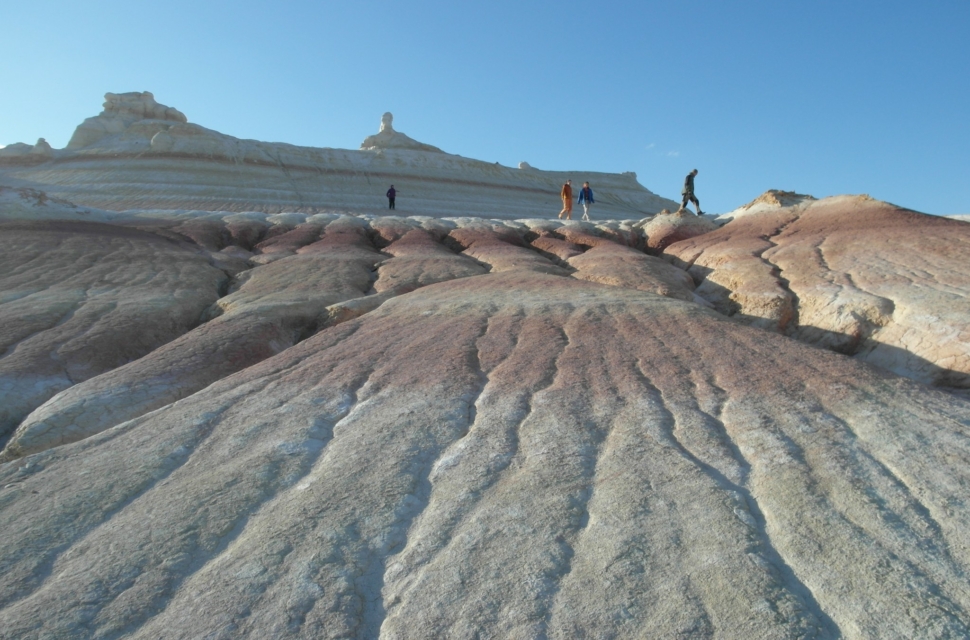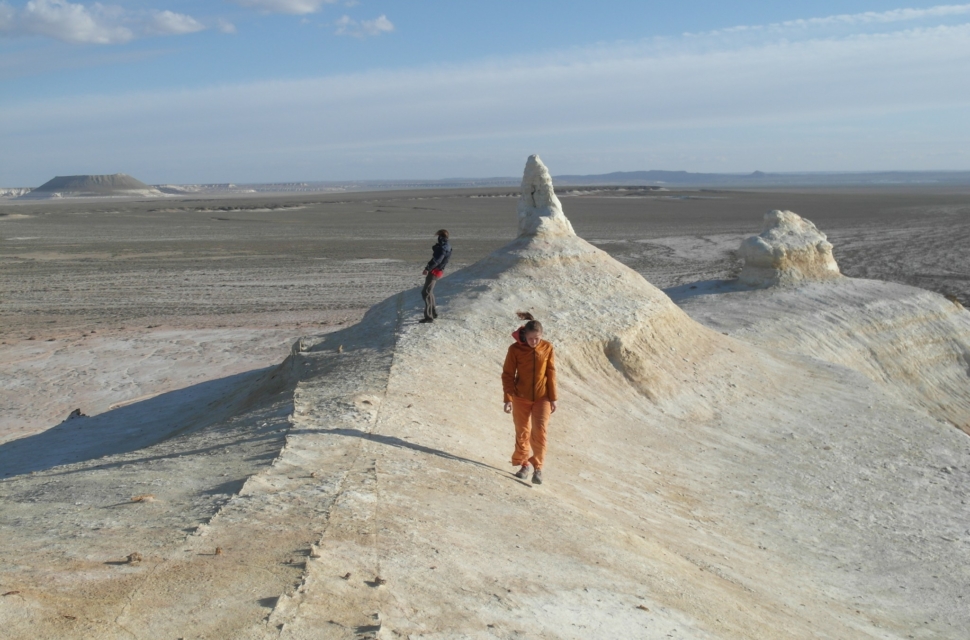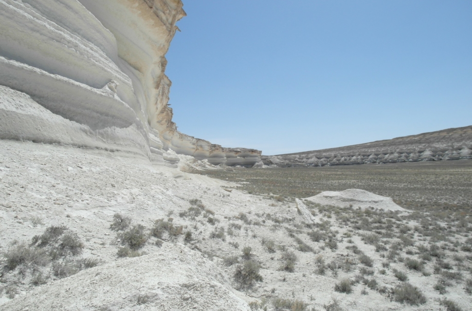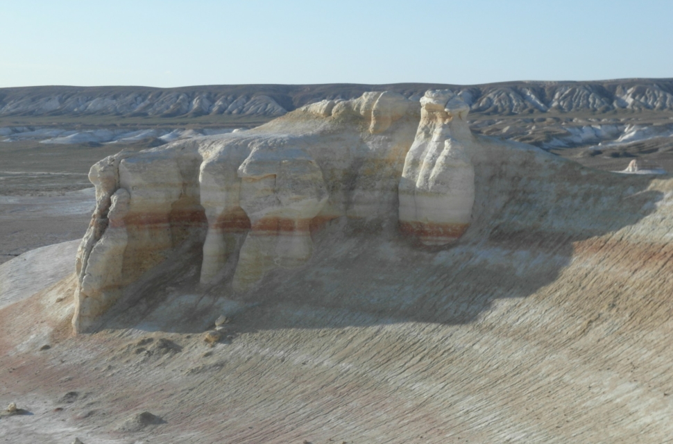 На самом плато было ужас как холодно, зато видели фламинго (правда, всего одного). В какой-то момент плато резко обрывается – и уходит пропастью метров на 200-300 вниз. И открываются совершенно космические, инопланетные пейзажи. Тысячи лет назад эти места омывали волны Каспия. Уйдя, они обнажили осадочные породы, мел, известняк, доломит. Белые, розовые, оранжевые, красные. Встречаются большущие черепахи, со здоровенным клювами – шипят на тебя. На месте этого перепада много всего интересного, но туристы там почти не бывают (во всяком случае, в интернете мы нашли, кажется, всего пару отчетов). В этих местах мы остановились на пару дней.