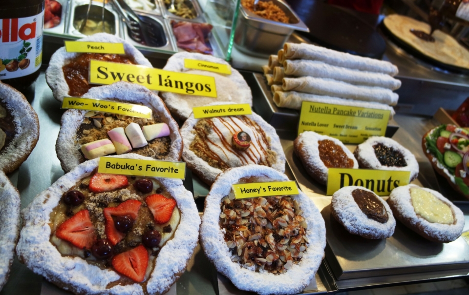 Типичный венгерский стрит-фуд. Лепёшка из дрожжевого теста, обжаренная в кипящем масле, которая сверху покрывается соусами и просыпается топингами. Классический вариант лангоша (что значит «пламенный» по-венгерски) – со сметаной и сыром. Набор-максимум дополнительно включает кусочки бекона, салями, ветчину, овощи и т.п. Еще в Будапеште можно встретить в продаже лангош-бургер из выше упомянутых лепешек и котлеты посредине. Бывает и сладкий лангош – с йогуртом или шоколадным сиропом, фруктами и сахарной пудрой. Надо сказать, langos – штука весьма сытная, вполне сойдёт для плотного завтрака в начале насыщенного дня.