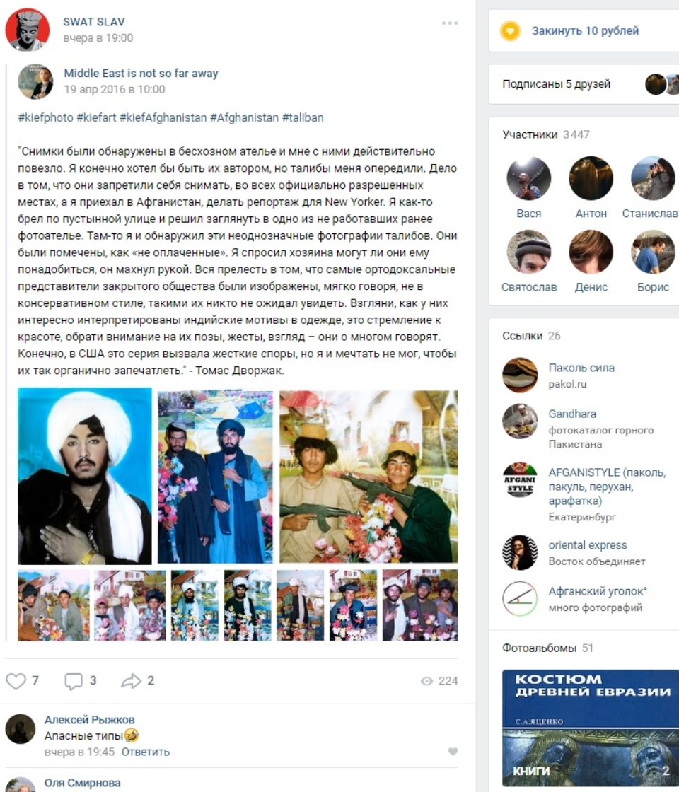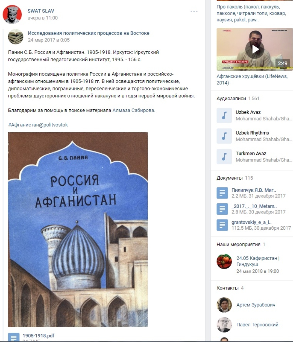 На эту страничку в ВК я набрёл случайно и, как часто бывает, надолго залип. Но впоследствии (а это бывает реже) не пожалел о потраченном времени. Такого пёстрого и при этом цельного содержания я, кажется, не видел ещё нигде. Подборки афганской музыки – то современной, то из каких-нибудь 70-х. Сканы редких книг по истории народов Гиндукуша. Фото из поездок через Памир. Лекции и документалки о народах Среднего Востока. Хроники жизни экзотического и неспокойного региона. Плюс – каталог традиционной афганской одежды (с особым вниманием к плоским шапкам “паколь”). Плюс странное название – SWAT SLAV. Я так и не понял, что это и для чего, но был крайне заинтригован и на группу подписался. Пока читал посты, стало ясно, что это почти субкультура – российские любители Среднего Востока, ориенталисты. Со своими приколами, сленгом, с множеством групп и публичных страниц в соцсетях, где счёт подписчикам идёт на тысячи. Немало для экзотической темы! И, более того, как-то постепенно я и сам стал таким любителем. Пусть пассивным и заочным, но всё же. Однако так и не понял, откуда взялись эти ребята, в чём корни их любви к этому неоднозначному региону и что же такое SWAT SLAV.