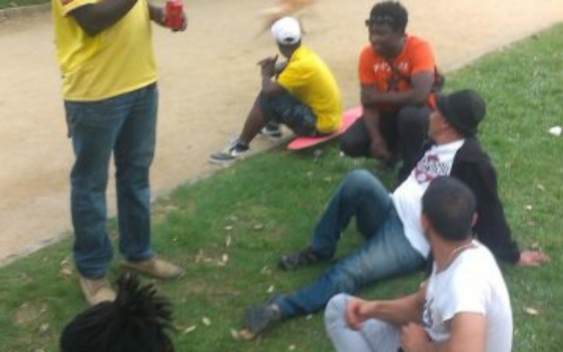 Через 10 минут Чарли вернулся с банками и мы отправились на соседнюю аллею. А там – человек десять молодых ребят, парней и девчонок. Со скейтами, биэмиксами и барабанами. Впрочем, было видно, что шумная тусовка уже шла на спад. Я разговорился с юношей такого же рэпперского вида, как и Чарли, только белым, – Стивеном из Ирландии. Мы выпили моего вина, а потом рядом со мной нарисовался другой негр – босой, в расстегнутой рубашке, с банкой пива и в жопу пьяный – с целью тоже стрельнуть у меня винца. Я протянул ему бутылку: