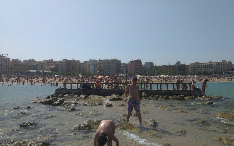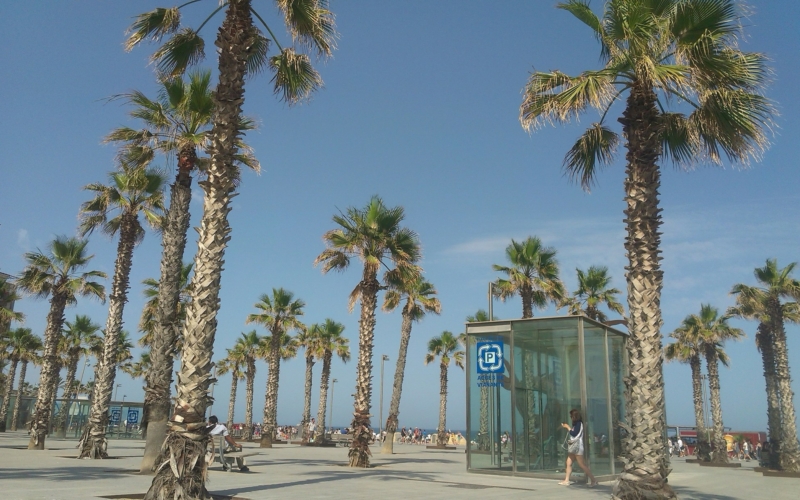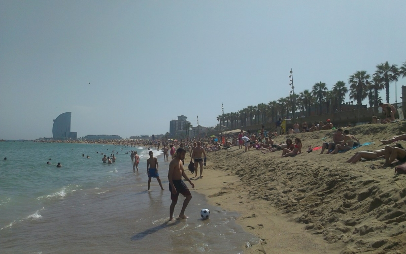 А потом вернулся в вечный праздник жизни этого города – вышел на улицу и поехал на метро к морскому пляжу. Через деловой квартал, мимо высоток из стекла и металла, от ближайшей станции к нему стекались многочисленные компании –майки, темные очки, пляжные сумки. Узкий пляж за бесконечным рядком пальм песчаным склоном спускался к воде – теплой и прозрачной, с мшистыми зелеными камнями. Народу было очень много – если бы я захотел расположиться позагорать с пляжным ковриком, то с трудом нашел бы место. Но я просто прошелся босыми ногами по линии прибоя – среди играющих в мяч детей, купающихся туристов, загорающих топлесс девушек и прочих. Посидел на длинном бетонном пирсе – там народу было меньше. Повалялся на камнях. На горизонте, если смотреть на юго-запад, виднелись крыши старого квартала – Барселонеты – и зеркальная высотка, похожая на огромный парус. Вскоре сквозь веселую суету, сквозь пляжные бары, мимо уличных музыкантов и стремительных скейтеров я пошел к ней. В Барселонете морские просторы сменились клаустрофобическими улочками старинного квартала, который клином врезается в Средиземное море.